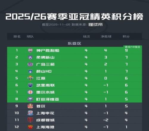 亚冠精英东亚区最新积分榜:中超三队包揽榜尾,海港垫底