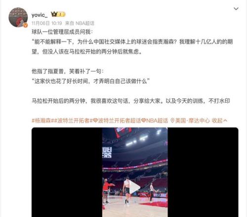 首先是球队的记者最近在社交平台透露了一个非常有意思的事情,他说他们球队的高层也注意到,在中国的社交平台有一些中国球迷指责杨瀚森不够上进,表现不够好。这位高层和队记打了一个比喻,他说没人该在马拉松开始的两分钟后就焦虑,担心中国球迷是不是有些操之过急?他还举例球队当中的夏普,这个年轻球员用了一个赛季才搞清楚自己知道在赛场上干什么,这个赛季夏普在常规赛获得非常多的出场时间和球权。
