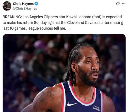在哈登爆砍55分带队取胜结束连败之际,名记Haynes也送来好消息,已经因伤连续缺席10场比赛的小卡预计将在周一对阵骑士的比赛中复出。