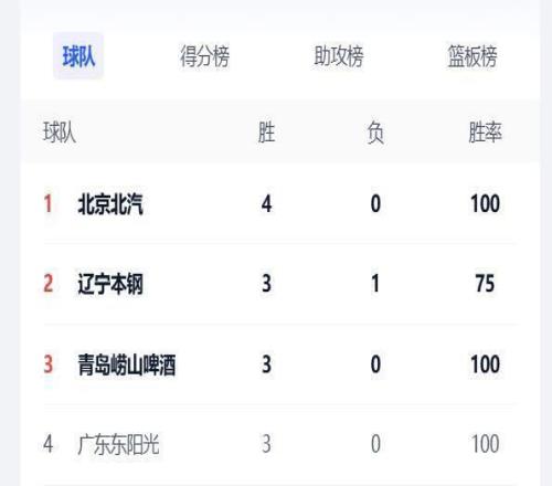 北京首钢队在常规赛前4轮保持不败,目前高居常规赛的战绩榜首;辽宁队3胜1负排名第2,而3战全胜的青岛队和广东队宏远队分别位列第3和第4。因为CBA常规赛排名是积分制,胜1场积2分,输1场积1分,因为辽宁队目前比赛场次要比广东宏远队和青岛队都多1场,所以积分就会较多,暂时排在了这两支球队的前面。而广厦队也是只打了3场,目前2胜1负积5分,排名较低也可以理解。