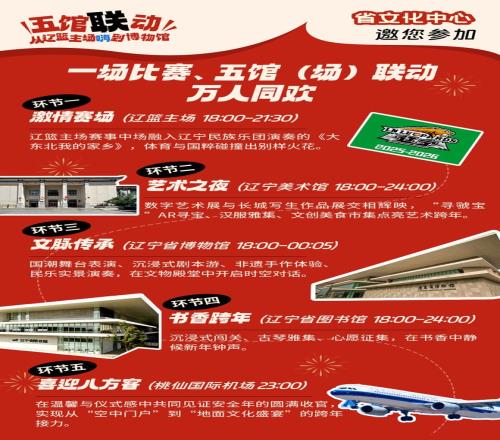 本次活动开创了辽沈地区“文博+文艺+阅读+体育”深度融合的先河。以辽宁男篮主场赛事为激情起点,通过精心设计的时间衔接与内容呼应,实现观众从体育馆到三大文化场馆再到桃仙机场的自然引流。活动口号“一场比赛、五馆(场)联动、万人同欢”精准概括了这场跨年夜活动的丰富内涵。
